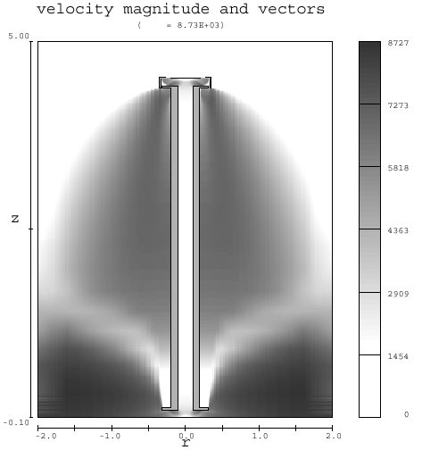| Рис.3 Распределение скоростей в газовом потоке при t=5 мс(слева) и t=6 мс | |