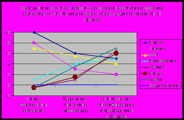 Сейчас это становится особенно важным, так как объективные данные показывают, что наше образование слишком задержалось на стадии, соответствующей индустриальному типу общества, тогда как другие страны сделали заметный шаг вперед. В середине 90-х гг. наши школьники значительно превосходили сверстников из других стран в знании фактического материала, сохраняли паритет в умении применять знания в обычных условиях, но отставали в использовании этой информации в непредвиденных ситуациях (рис. 1).