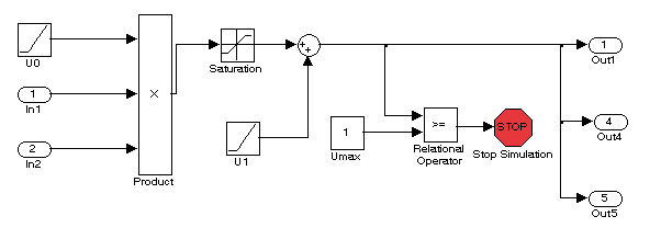 Блоки In1, In2 подсистемы являются ее входом. Сигнал, подаваемый на входной порт подсистемы через блок, передается внутрь подсистемы. В нашем случае входной порт In1 будет показывать величину HB твердости детали. Блок In2 передает значение пластичности поверхностного слоя δ. Блоки U0, U1 являются источниками линейно изменяющегося воздействия. Блок Saturation устанавливает значение износа, полученного при приработке. Umax – блок, содержащий значение максимального износа, останавливающий (блок Stop Simulation) работу модели при выполнении определенного равенства (блок Relational Operator). Блок Product выполняет умножение сигналов его входов. Out1 – блок, выводящий на виртуальный осциллограф U графики износа или на цифровой дисплей, отображающий значение сигнала в виде числа. Результат моделирования представлен на рис. 2.