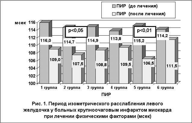 В ходе лечения отмечено повышение толерантности к физической нагрузке. Её наибольший прирост наблюдался у больных 2-ой (на 53,3%, p<0,01), 1-ой (на 52,4%, p<0,02) и 5-ой (на 51,7%, p<0,01) групп. Положительное влияние на диастолическую функцию левого желудочка в виде укорочения ПИР наблюдалось достоверно только у больных после лечения электрофорезом аминазина в переменном магнитном поле (p<0,01) и амплипульстерапией (p<0,05) (рис.1).