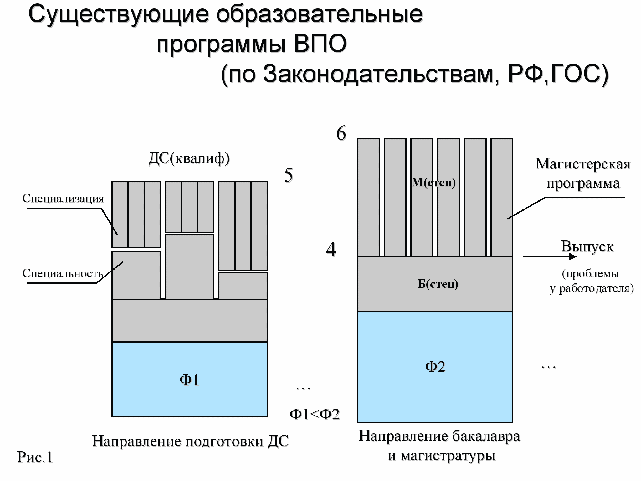 Вся система высшего (профессионального) образования трансформируется по формату «бакалавриат+магистратура». Вводится различие между бакалавриатом/магистратурой по направлению и бакалавриатом/магистратурой по специальности; нормативный срок реализации программы бакалавриата по направлению и по специальности – равным 4 года. Программа бакалавриата по направлению в большем объеме содержит дисциплины циклов ГСЭ и ЕН, это широкое образование университетского типа. Выпускники – младший персонал НИИ и др. учреждений, учителя для системы среднего образования, прежде всего «элитного». Магистратура по направлению с нормативным сроком программы 2 года, дает сформировавшихся исследователей и, при наличии дополнительной квалификации, преподавателей высшей школы. Программа бакалавриата по специальности в меньшем объеме содержит дисциплины цикла ГСЭ, в большем – ОПД и СД; это типичное «техническое» образование, которое отличается от традиционного 5-летнего преимущественно более экономной компоновкой учебного плана. Выпускники – инженеры, учителя, агрономы и т.п. Магистратура по специальности дает инженеров-конструкторов и аналогичных им специалистов, которые должны владеть в соответствующем объеме теоретическими познаниями, навыками анализа и т.п. [1].