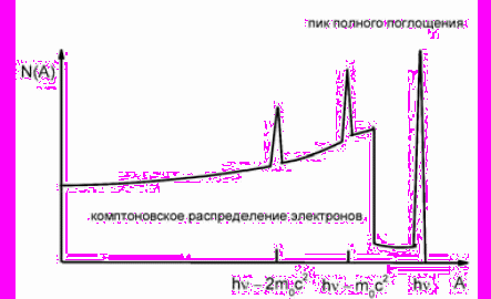 (10)Вид этого спектра представлен на рис. 8. Правая граница спектра электронов называется комптоновской границей. Если бы все рассеянные кванты покидали кристалл после рассеяния, то амплитудный спектр имел бы вид спектра комптоновских электронов. Однако, рассеянные кванты могут рассеяться вторично или испытать фотоэлектрическое поглощение. Идеализированный спектр с учетом только комптоновского рассеяния имеет вид пика соответствующего полному поглощению и непрерывного распределения электронов после комптоновского рассеяния. Расстояние между краем комптоновского распределения и пиком полного поглощения при hν >> m0c2/2 становится приблизительно равной 256 кэВ. Между границей комптоновского распределения и пиком полного поглощения не должно быть импульсов, однако не все кванты после вторичного рассеяния остаются в кристалле, так как часть их покидает сцинтиллятор. По этой причине появляются импульсы с меньшей амплитудой как показано на рис. 8. Свободными электронами в кристалле считаются наименее связанные, находящиеся на верхних оболочках атомов. Учет их скорости приводит к тому, что комптоновский край становится не таким резким как показано на рис.8. Острая вершина идеализированного спектра электронов закругляется. Соотношение площадей пика полного и непрерывного распределения сильно зависит от объема сцинтиллятора . Чем больше объем, тем больше это отношение. Геометрия опыта и в, частности, коллимация первичного пучка также играют существенную роль.