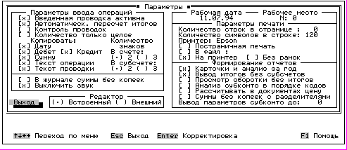 Для выбора устанавливаемого параметра используются клавиши управления курсором. Для установки параметра следует нажать клавишу Enter. Если параметр имеет только два значения “Да” или “Нет” ( против названия параметра стоят квадратные скобки), то текущее значение меняется на противоположное. При этом значение "Да" отображается значением "X", "Нет" - пробелом. Для других параметров предлагается ввести новое значение. Для выхода из ре жима нажать клавишу Esc.