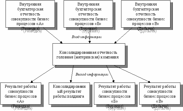 Из совокупности учетных массивов по вышеперечисленным показателям формируется связанная информационная система, отражающая основной результат деятельности связанных структур внутри холдинга и являющаяся основой для обеспечения информационной модели внутреннего контроля.