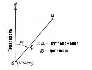 - Відстанню ОМ = Д від полюсу до точки М, що визначається.