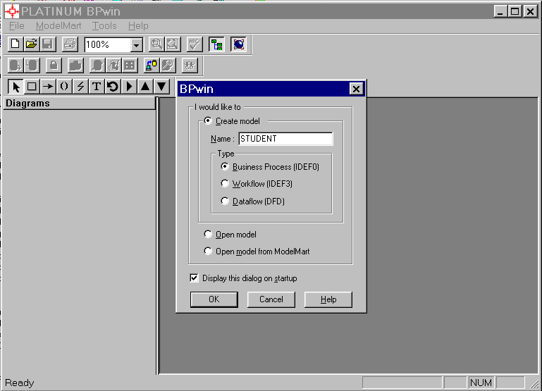 Активизируйте файл BРwin. Выберите тип методологии (по умолчанию IDEF0), наберите имя модели "STUDENT" и нажмите – OK (рис. 2).