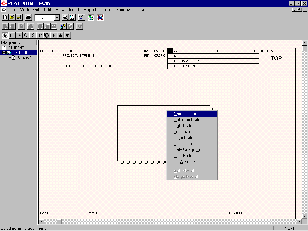 Текст в функциональном блоке содержится в пределах единственного графического объекта. Для того чтобы ввести текст в функциональный блок, необходимо активизировать правой кнопкой "мыши" свойства функционального блока и выбрать опцию "Name Editor" (рис. 7). В появившемся окне "Name" (рис. 8), в строку поля имени блока введите название блока. Например, "ОБУЧЕНИЕ В УНИВЕРСИТЕТЕ". В строку поля "AUTHOR" введите фамилию автора проекта. Например, "Иванов". Нажмите кнопку "ОK".