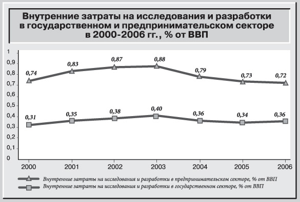 Попытался внести ясность в этот вопрос эксперт проекта, ведущий аналитик InnoPolicy TrendChart Славко Радошевич. По его мнению, российским властям надо честно признать, что большой рост ВВП в России не основан на росте инноваций. «Все увеличение финансирования в инновации приходится на госсектор; в сфере НИОКР нет существенных изменений, и это плохой симптом», – считает европейский эксперт. Заметим, что доля бюджетных средств в структуре внутренних затрат на ИР в 2006 году составила 60,1%. «Вы еще не наполняете свою промышленность и экономику инновационными технологиями, – подчеркнул Радошевич. – Вы делаете промежуточные продукты».