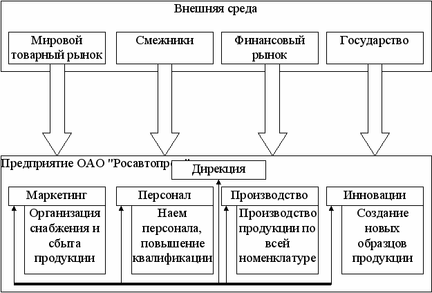 По нашему мнению, ОАО "Росавтопром" имеет функциональную структуру, основанную на дивизиональном разделении по подразделениям. В этой ситуации существенное влияние на эффективность организационной структуры оказывает маркетинговая ситуация на соответствующих товарных рынках. Как правило, такая зависимость влияет на дефицит финансовых ресурсов, что зачастую предполагает трудности в диверсификации и расширении объемов производства.