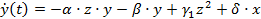 где t – безразмерное время; s – регулируемый параметр, характеризующий степень влияния макропеременных друг на друга; a(y, z), b(x, z), c(x, y) – функции влияния, обуславливающие кооперативный или антагонистический характер взаимодействия макропеременных.