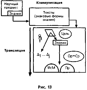 Здесь примечательно, что внутри системы научного предмета (если оставить в стороне некоторые вырожденные режимы работы) знание создается, разрабатывается и развивается именно как знание, затем переводится в форму каких-то текстов коммуникации, которые, с одной стороны, должны достаточно точно выразить само знание, а с другой — должны быть соответствующим образом поняты теми, кто хочет увидеть в этих текстах знания, и, наконец, в актах деятельности они вновь могут выступить как знания такие же, какими они были в научном предмете, или другие.