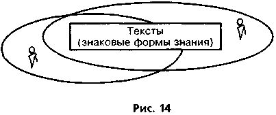 Здесь особенно важно еще то, что в процессе трансляции тексты поступают не к отдельным людям, а в связке «учитель-ученик», и уже эта сложная пара строит в соответствии с извлекаемыми ими из текста знаниями новые структуры деятельности ученика (рис. 14).