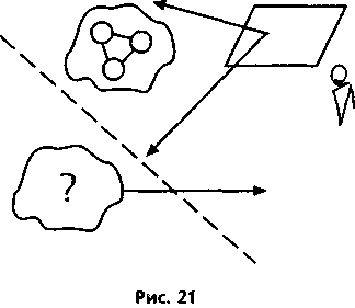 Представим себе, что у меня есть схема моего объекта. Вот я ее начертил и начинаю ее понимать как схему объекта. Каждое знание несет четыре содержания - оно показывает свой язык, или форму, указывает на объект, указывает на операции и на понятия. Значит, систему я должен понимать в этих четырех планах и знать, что к чему относится. Теперь я задаю вопрос (рис. 21). Вот мне дана эта схема, и я знаю, что эта схема изображает объект, но я спрашиваю: каков этот объект? Этот вопрос мы задаем постоянно, когда идет передача знания. Тот, кто слушает и должен понять сообщение, все время спрашивает, каков объект -тот объект, с которым он в практической ситуации будет иметь дело.