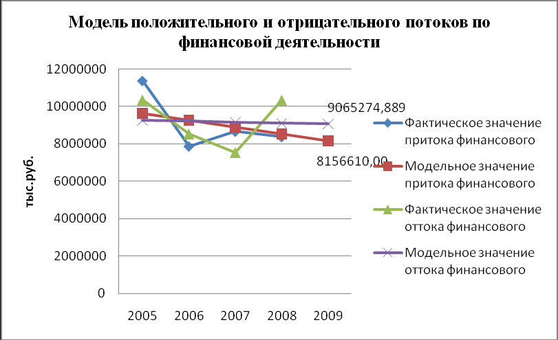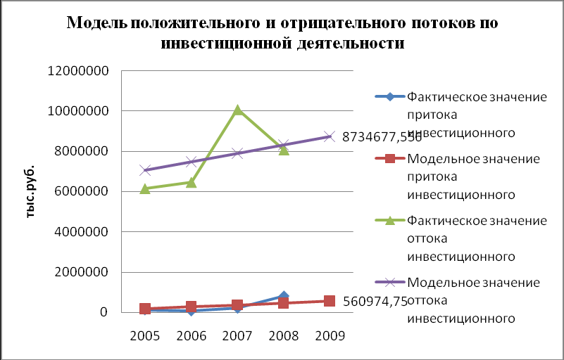 Модель притока средств от инвестиций адекватна и соответствует реальности на 92%. Однако модель оттока средств значительно сглаживает резкий скачок расходования в 2007 году, а поэтому неадекватна и соответствует реальности лишь на 23%. Несоответствие адекватности модели подтверждает также и проверка (Fфакт для оттока инвестиционных средств равна 3,59). Построенные прогнозные значения притока средств в 2009 году равны 560 974, 75 тыс.руб., а оттока средств - 7 734 677,56 тыс.руб. Также по графику заметно значительное превышение отрицательного потока инвестиционных средств над положительным, что влечет за собой отрицательное значение чистого денежного потока по инвестиционной деятельности.