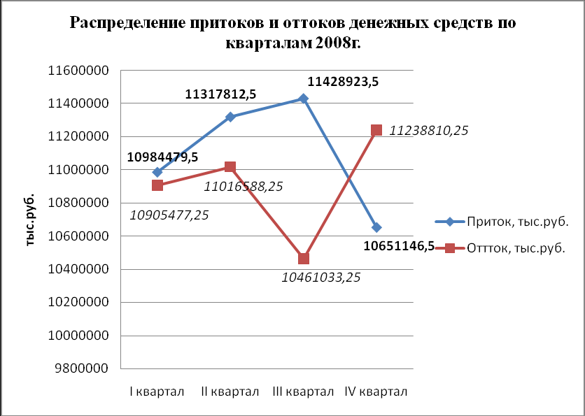 Рисунок 1 – Динамика распределения притоков и оттоков средств по кварталам 2008 года