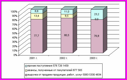Наибольший приток денежных средств связан с выручкой от продаж, что наглядно отражено на рисунке 3. Однако за анализируемый период доля выручки в структуре «притока» денежных активов снизилась с 77,7% в 2001 г. до 76,8% - в 2003 г. или на 0,9 процентных пункта. При этом возросла доля прочих поступлений с 8,8% в 2001 г. до 23,2% - в 2003 г. Рост составил 14,4 процентных пункта.