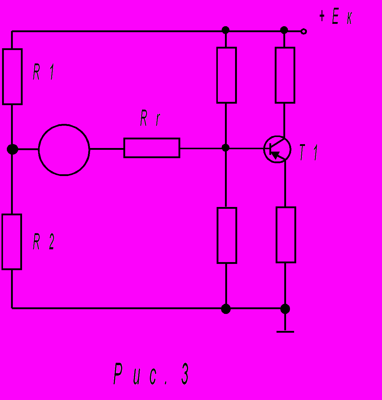 Нагрузка усилителя обычно включается в диагональ моста, образованного элементами выходной, цепи УПТ. На рис. 4 приведена принципиальная схема такого выходного каскада УПТ. Рассматриваемый здесь способ включения нагрузки используется для получения Uн=0 при Еr=0. Номиналы резисторов R3 и R4 выбираются таким образом, чтобы напряжение средней точки делителя равнялось напряжению на коллекторе выходного транзистора в режиме покоя. При этом в нагрузке для режима покоя не будет протекать тока. В каждом каскаде УПТ прямого усиления за счет резисторов в цепи эмиттера образуется глубокая ООС. Поэтому для определения входного сопротивления Kuoc каскада ОЭ здесь можно пользоваться формулами