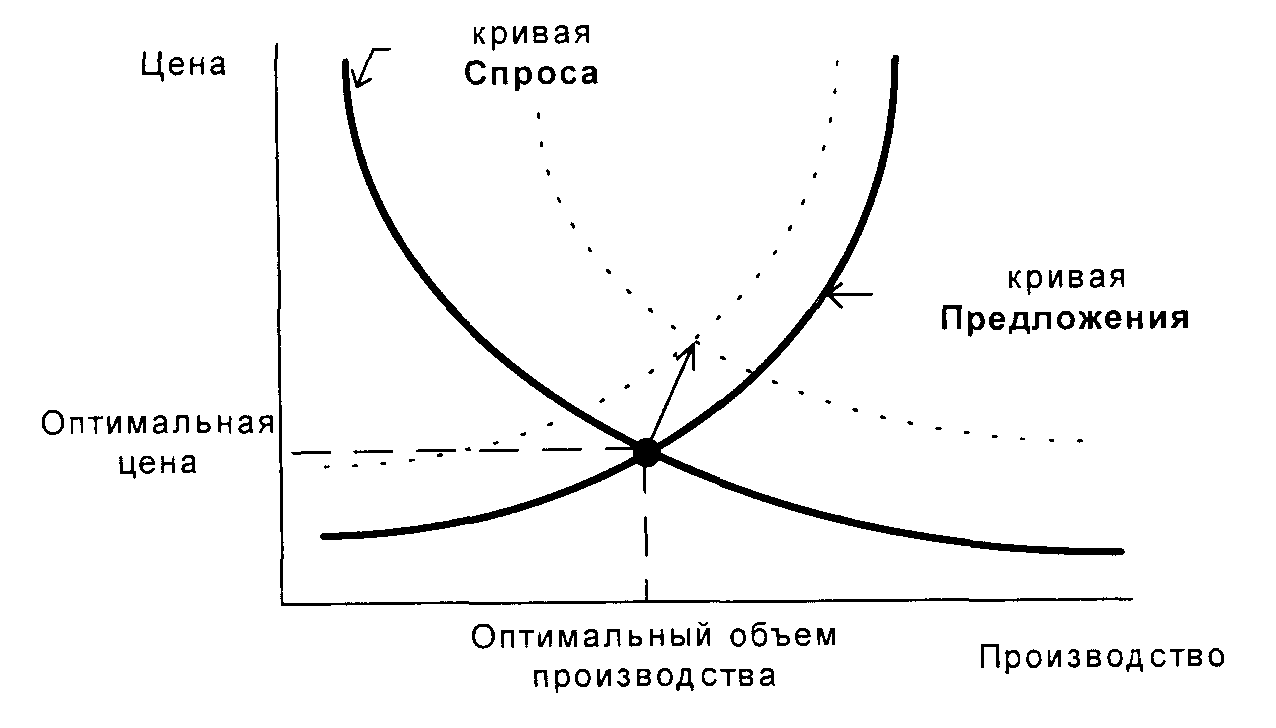 Графическое изображение линий спроса и предложения (см. рис. 2-1) показывает, как при любом уровне последних находятся точки равновесия, которые определяют цены и объемы производства. Сдвиг любой из линий их приводит к новой точке равновесия, которая характеризуется другим значением оптимальной цены и объема производства. Такой сдвиг, как мы видели, может стимулироваться как спросом, так и предложением. Подробный анализ их взаимодействия, а также графическую интерпретацию этого процесса можно найти в любой книге по макроэкономике.