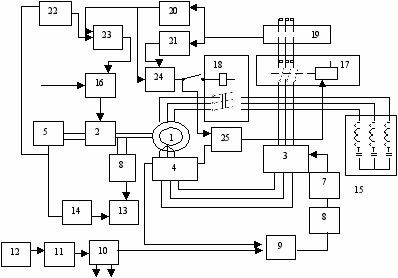 В четвёртой главе приведены разработанные элементы и устройства измерительной техники, системы управления ресурсными испытаниям генератора. Разработана экспериментальная установка - стенд испытаний ЭГУ с вентильным электрогенератором 94.3701, 37.3701 для автомобилей ВАЗ–2110, 2109, 21213, АЗЛК–214201-10; с вентильным электрогенератором Г 222 для автомобилей ВАЗ–2107, 2105, ЗАЗ–1102. Стенд содержит: 1 – ЭГУ; 2 – ДВС; 3 – коммутатор; 4 – датчик тока; 5 – датчик частоты вращения вала; 6 – датчик нагрузочного момента; 7 – система импульсно-фазового управления; 8 – корректирующее устройство; 9 – сумматор; 10 – переключающее устройство; 11 – блок управления частотой; 12 – задатчик канала частоты вращения; 13 – блок управления, и др. (рис. 6).