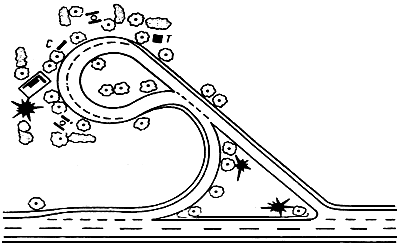 Барьерные посадки подсказывают водителю невозможность продолжать движение в том же направлении, являясь в то же время зрительными "отражателями" взгляда, заставляющими перенести взор в нужную сторону. Их располагают по тому же принципу, что и направляющие: они нужны главным образом на перекрестках, остановках автобусов, транспортных развязках, но могут быть использованы и на площадках отдыха и в комплексах обслуживания движения (рис.3.11.).
