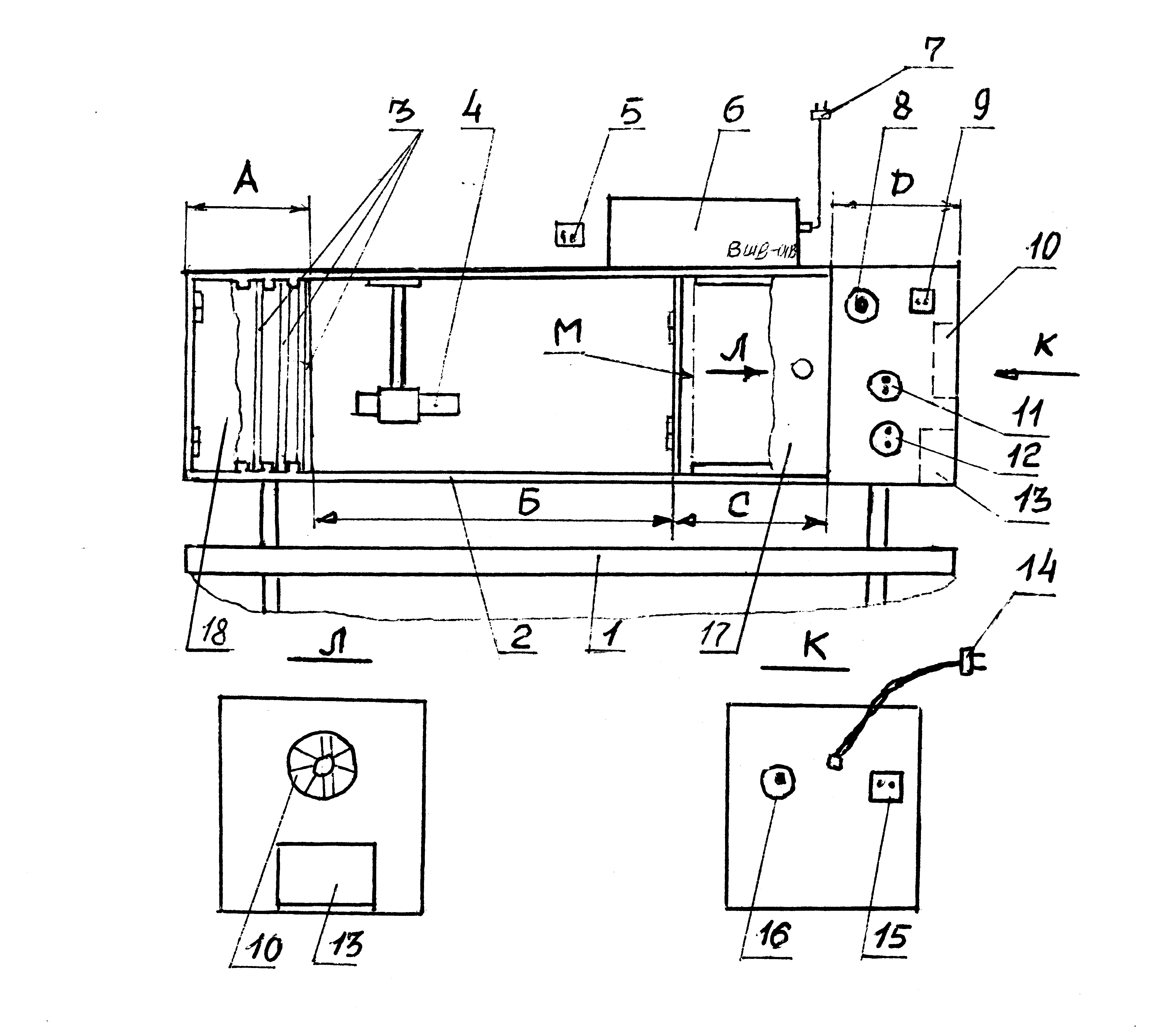 1 – Из секции А рис. 2 выбирается нужный номер пластины (в соответствии с вариантом задания) и устанавливается в паз М секции С. Затем следует закрыть плотно дверцу 17 и включить ревун 10 и звонок 13 переключателями 11 и 12.