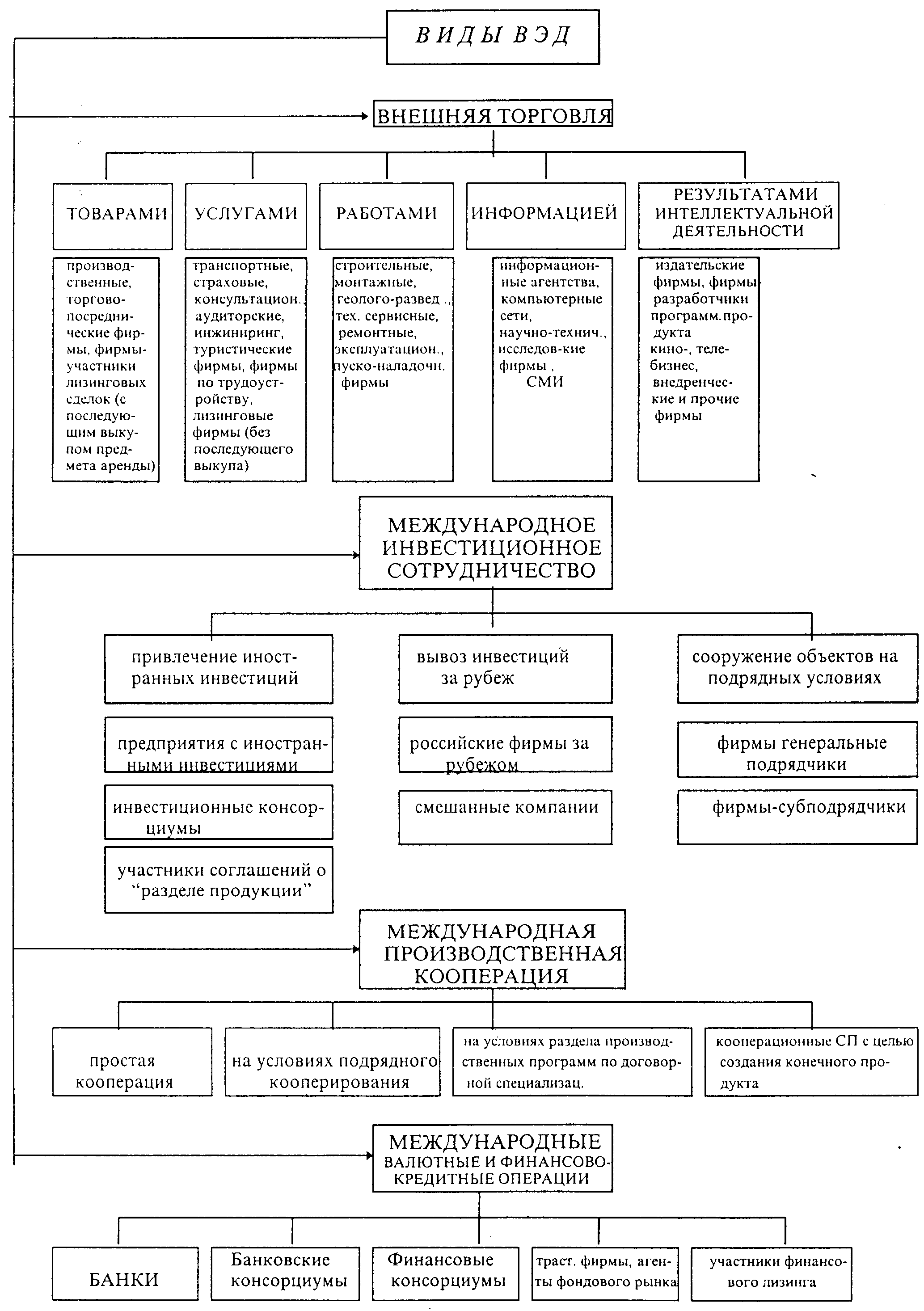 Все многообразие участвующих во внешнеэкономической деятельности фирм классифицируется по критерию принадлежности к тем или иным видам ВЭД (Схема 1). Такой подход имеет большое значение для понимания применяемого дифференцированного воздействия системы государственного регулирования на процесс ВЭД с учетом приоритетов национальных интересов.