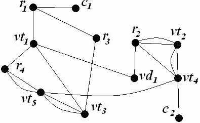 В данной принципиальной электрической схеме можно выделить группы РЭК, имеющие соединения между собой более чем в одном узле. К таким РЭК относятся: резистор R2 и транзистор VT2, имеющие соединение в узлах c и e; транзисторы VT2 и VT4 (соединяются в узлах e и f), транзисторы VT3 и VT5 (соединяются в узлах g и h); резистор R3 и транзистор VT4 (соединяются в узлах f и g); резистор R4 и транзистор VT5 (соединяются в узлах b и h). Для всех узлов данной схемы выполним развязку и построим по два варианта связывающих деревьев. В первом варианте учёт связей между параллельно соединёнными РЭК будет сведён к минимуму, т.е. из полного подграфа каждого узла будет удалено ребро, связывающее параллельно соединённые РЭК. Второй вариант связывающих деревьев будет построен с сохранением в каждом узле ребер, связывающих параллельно соединённые РЭК. Так, например, резистор R4 и транзистор VT5 имеют соединения в узлах b и h. Для связывающих деревьев подграфов этих узлов могут быть выбраны крайние варианты: с сохранением рёбер u(r4, vt5) в обоих узлах и без сохранения этих рёбер.