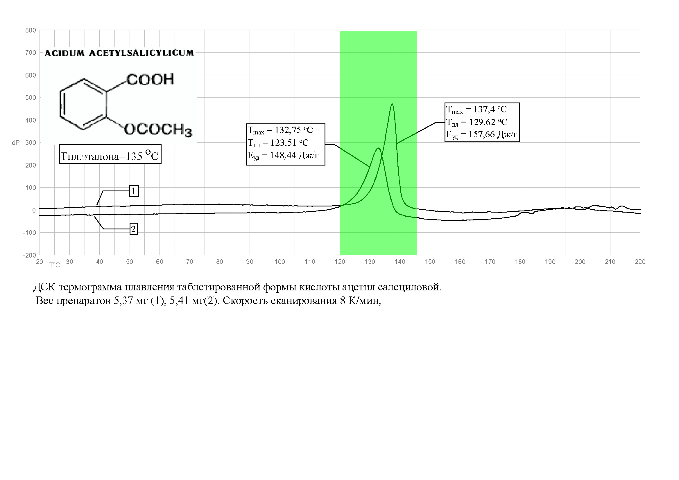 Дифференциальная сканирующая калориметрия (ДСК) является перспективным методом контроля качества в различных производственных процессах [1,2]. Метод начинает находить применение и в производстве лекарственных препаратов (ЛП), для контроля сырья и продуктов в технологических процессах, так и для контроля качества конечных продуктов [3,4]. Фармакопеи многих стран уже контролируют степень чистоты ЛП по температуре плавления, полученной методом ДСК [6, 7, 8, 9]. Однако метод позволяет получить гораздо более полную характеристику физических свойств ЛП (плавление, полиморфные превращения, испарение, сублимация, десольватация, термодеструкция), дать оценку состояния, а также произвести количественный анализ, анализ степени чистоты, как самого активного вещества, так и основных наполнителей. Наличие современной метрологической базы таких измерений обеспечивает их объективность и точность. В тоже время, в фармакопее России, изданий вплоть до XI, используется температура плавления как одна из характеристик подлинности ЛП. Однако при этом применяются «древние средства измерений»: регистрация самого момента плавления и температуры плавления осуществляется визуально (по внешнему виду твердого образца в капилляре или с помощью термометра типа Убеллоде) [10]. Отсутствие современных термических методов контроля в отечественных фармакопейных статьях объясняется отсутствием у разработчиков ЛП информации, что такие приборы давно производятся, являются доступными и обладают необходимым метрологическим обеспечением. Точность этих приборов на порядок превосходит точность применяемых средств и методов контроля, упомянутых выше.