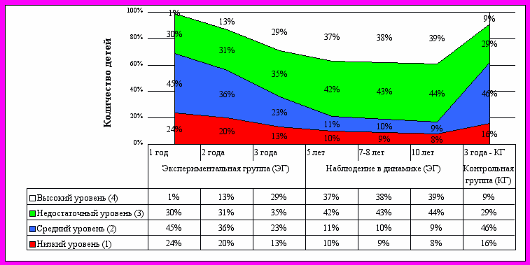 Для объективизации оценки были введены количественные показатели, позволяющие проследить степень их выраженности. Количественная оценка действий ребенка была единой для всех изучаемых «линий развития». Уровень сформированности различных функций оценивался по четырехбалльной шкале (от минимального – 1 балл до максимального – 4 балла): 1 балл – отсутствие или выраженные нарушения развития функции (низкий уровень);2 балла – умеренно выраженные нарушения (средний уровень); 3 балла – незначительные нарушения развития функции (недостаточный уровень);4 балла – нормальное развитие функции (высокий уровень). Четыре оценочных уровня (от низшего к высшему) выполнения заданий детьми представляли собой описание основных вариантов степени развития изучаемых функций.