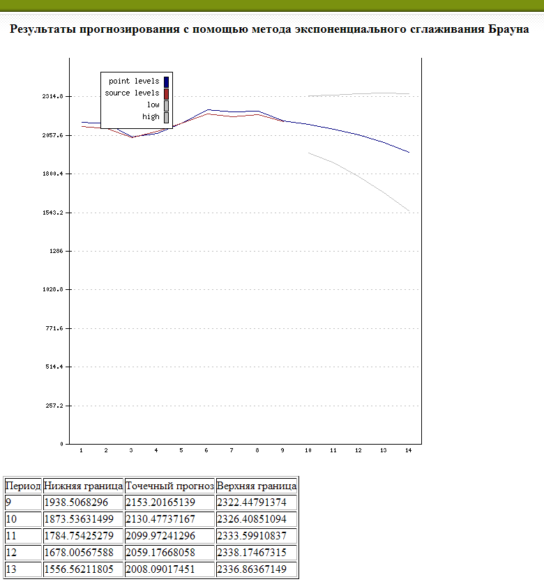В качестве аппроксимирующей функции был выбран полином второй степени. После нажатия кнопки «Построить прогноз» открывается окно с результатами прогнозирования (рис. 9), где отображается график исходных уровней ряда (source levels), точечный прогноз (point levels), нижняя (low) и верхняя (high) границы интервального прогноза. Кроме графической интерпретации, выводится таблица прогнозов.
