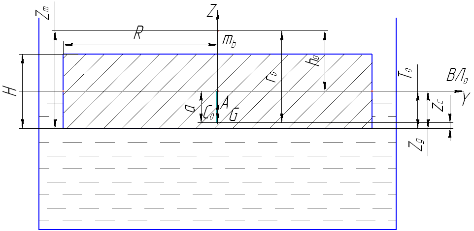 При расчете объемного водоизмещения необходимо учитывать массу понтона с успокоителями, а при расчете статической остойчивости – массу понтона, успокоителя и продукта, находящегося в успокоителях, поэтому при определении объемного водоизмещения используется глубина погружения Т0 1, определяемая по формуле: