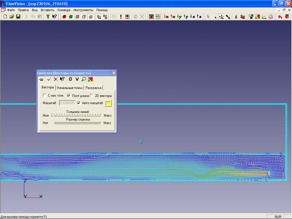 Как показали результаты, использование расчетной модели винта (задав его движение в виде вращения с требуемой частотой, которая адекватно описывает и течение в резервуаре, и формирование струи от винта) требует при проведении расчетов значительных вычислительных ресурсов – большой оперативной памяти компьютера в сочетании со значительным количеством итераций на проведение самого расчета.