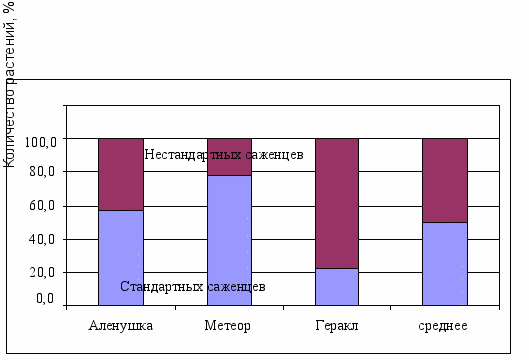 Количество саженцев на одно маточное растение составляет от 3,3 у сорта Аленушка, до 14,2 у сорта Бальзам. Максимальное количество стандартных саженцев отмечено у сорта Метеор (75,7%).