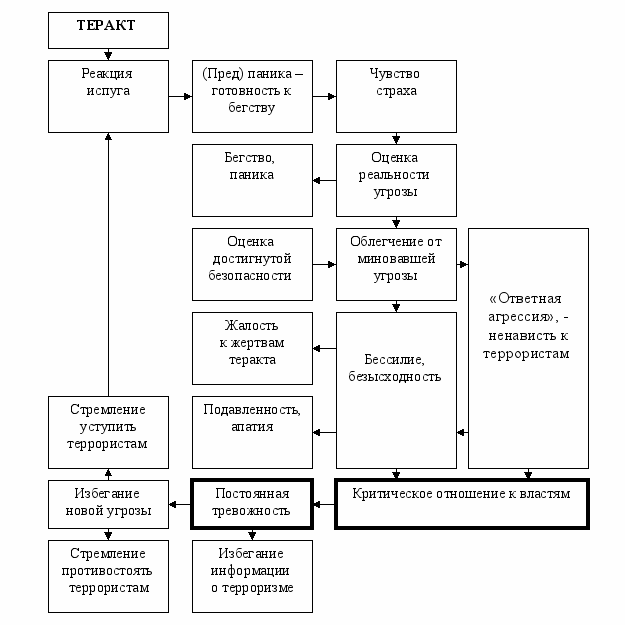 Последовательные реакции людей на теракт можно условно разбить на три стадии: рефлекторную, психологическую и социальную. На начальной, рефлекторной стадии первая, нормальная реакция – мгновенный испуг, тут же переходящий в готовность к бегству или в реальное бегство. Через несколько мгновений человека «догоняет» чувство страха, наступает более осознанная и концептуальная реакция: индивид уже становится способным оценить реальность угрозы и пытается это сделать. По результатам реакции бегство продолжается, или испытывается облегчение от миновавшей угрозы. Затем начинается не рефлекторная, а уже психологическая реакция на теракт.