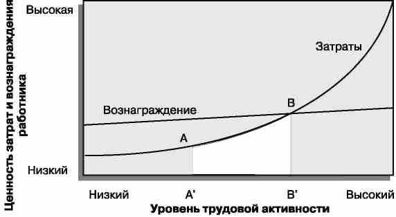 Рис. 7.1. Трудовые затраты в соотношении с вознаграждением работнику. Уровень трудовой активности работника находится на отрезке A’B’