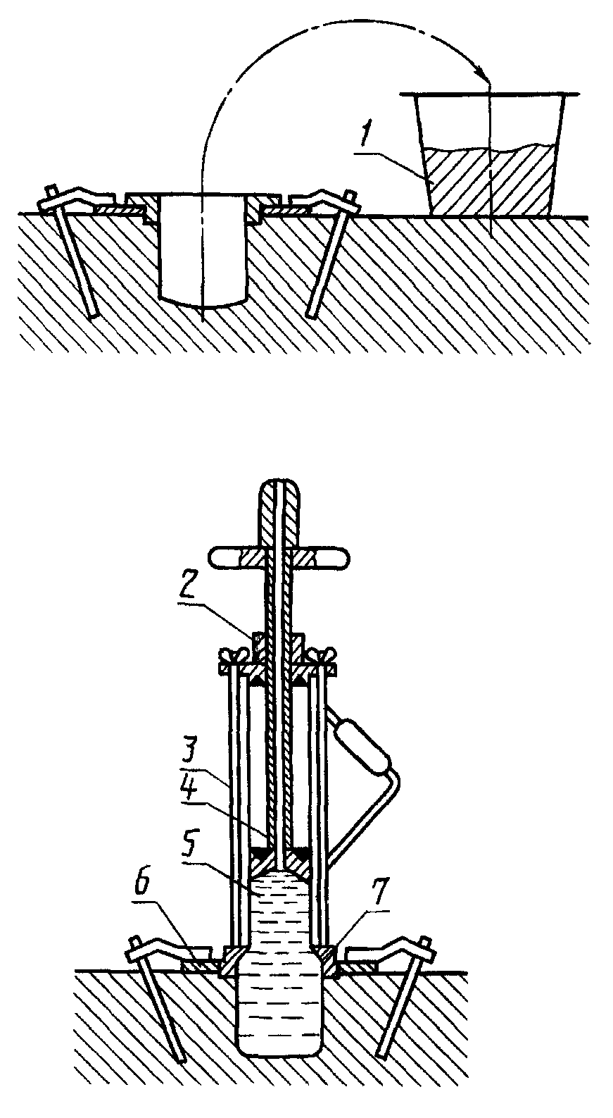 3.3.2. Полностью наполненный песком пескозагрузочный аппарат массой m1 (при закрытой задвижке) помещают на лист основания, расположенный над лункой, затем, открыв задвижку, высыпают песок в лунку. Как только визуальное движение песка прекращается, закрывают задвижку и, сняв аппарат, измеряют его массу (m4).