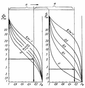 3.38. Для определения μ и Еg может быть использована специальная номограмма (рис. 4). Отправной точкой является отношение vR/vP, откладываемое на оси абсцисс; ордината пересечения его с кривой 1 дает значение μ; далее определяется точка пересечения ординаты, имеющей значение μ, с кривой 2, затем абсциссы этой точки с прямой 3, соответствующей известному значению g, и далее ординаты этой точки с прямой 4, соответствующей значению vP; абсцисса этой точки является искомым значением Eg.