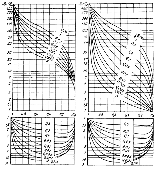 По указанным формулам на основе данных рис. 1 были рассчитаны номограммы рис. 2-5 слоисто-сетчатых криотекстур. Номограммы построены для различных μ = ρл/ρпр При этом ρпр определялось из номограммы 1 для соответствующего типа грунта, а ρл всегда принималась равным ≈ 105 Ом∙м, которое характерно для пресных льдов. Параметр номограмм q/m определяет степень слоистости: q/m = 1 - равномерно-сетчатая; q/m = 0 - слоистая.
