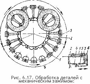 Производительность операции более 100 колец в минуту. Отклонение от параллельности боковых сторон кольца ие превышает 0,02 мм. При чистовом шлифовании (рис. 6.21, в) кольца 3 из магазина 2 передаются цепным конвейером 1 по направляющей пластине 4 в зону шлифования.