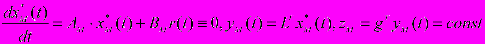 (15)ЯЭМ позволяет задать желаемым образом динамику объекта управления, при этом в системе управления может использоваться эталон минимальной структурной сложности – ЯНЭМ. Понижение порядка эталонной модели достигается за счет соответствующего выбора компонент вектора g и задания собственных значений матрицы AM. Для ЛСЧ с относительным порядком ее передаточной функции (n – m) = 1 это позволяет сформировать ЯЭМ в виде апериодического звена 1-го порядка, описываемого уравнением