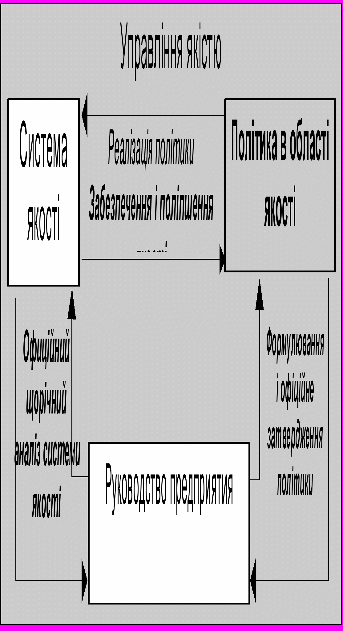 Управління якістю - аспекти виконання функції управління, що визначають політику, цілі і відповідальність в області якості, а також здійснюють їх за допомогою таких засобів, як планування якості, оперативне управління якістю, забезпечення якості і поліпшення якості в рамках системи якості.