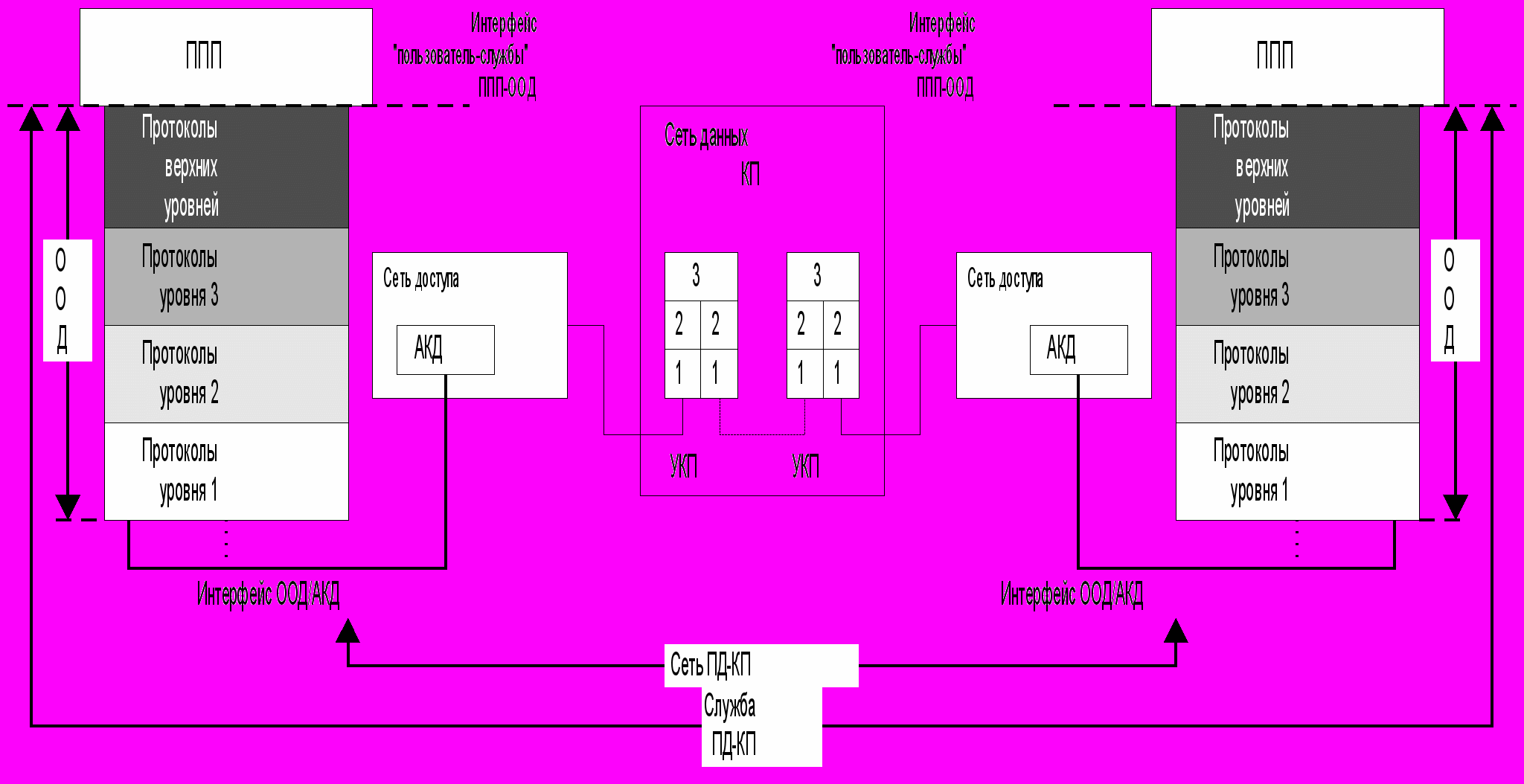 Сеть ПД заканчивается аппаратурой окончания канала данных – АКД. Интерфейс АКД/ООД является границей сети ПД и точкой взаимодействия этой сети с оконечным оборудованием данных (ООД). Узлы коммутации пакетов (УКП) включают три нижних уровня (1-3) протоколов эталонной модели взаимодействия открытых систем по рекомендации МСЭ, а ООД – помимо трех нижних уровней, еще и протоколы верхних уровней.