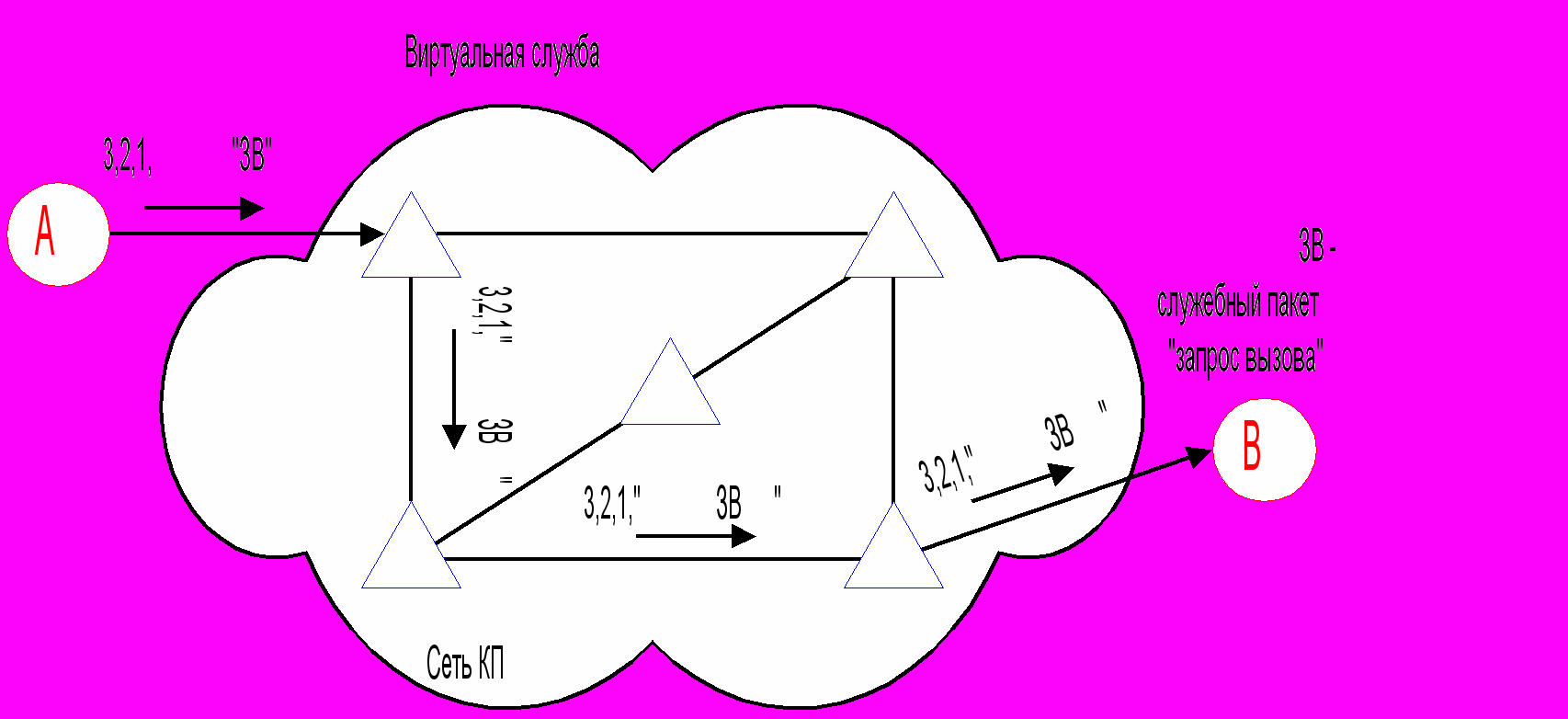 - От источника передается пакет «запрос соединения». Этот запрос проходит через всю сеть, на любом участке сети может быть использован любой логический канал из возможных 4096. Когда пакет придет к получателю, то путь его будет зафиксирован, т.е. будет записано в ЦКП, что определенные логические каналы закреплены за данным виртуальным соединением, следовательно, они другому виртуальному соединению присвоены не будут.