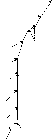 Для аппроксимации параболического уравнения с первым порядком в n-мерном случае требуется шаблон, содержащий (2n+1) сеточных узлов (включая рассчитываемый). Если фиксировать этот шаблон (как это было сделано в случае регулярной сетки), то построение связей происходит только один раз перед расчётами. Если же коэффициенты уравнения сильно изменяются в ходе расчётов, то построение оптимального шаблона можно проводить на каждом шаге или через несколько шагов (как для нелинейных гиперболических уравнений), однако в силу резкого понижения быстродействия это делать нецелесообразно (см. также начало данного раздела). Поэтому каждый внутренний узел необходимо связать с 2n ближайшими узлами, как и для гиперболических схем (см. 3.3.2.1), что позволяет использовать для «параболических» и «гиперболических» элементов один и тот же суперкласс. Последующий алгоритм связывания объектов схемы многоточечной прогонки, присоединенных ко внутренним узлам, более сложен. Для того, чтобы реализация метода не слишком зависела от размерности, предлагается создавать специальные объекты связей между объектами схемы, которые на этапе расчёта будут хранить соответствующие прогоночные коэффициенты. Эти связи в объекте схемы делятся на n входных и n выходных связей. Входные связи необходимы при вычислении прогоночных коэффициентов для выходных связей на прямом ходу прогонки, а выходные связи используются самими сеточными узлами для расчёта их значений на обратном ходу. Разделение на входные и выходные связи происходит автоматически в ходе процесса связывания, который инициируется граничным сеточным узлом первого типа (см. выше), беспорядочным образом распространяясь по сетке вплоть до граничных узлов второго типа. Следует заметить, что перед беспорядочным связыванием объектов схем внутри области интегрирования необходимо, чтобы все граничные узлы образовали связи с n приграничными объектами схемы; в противном случае граничный узел (как узел первого типа) может связаться с объектом схемы, который уже связал себя с данным узлом (как с узлом второго типа). Запрещение двунаправленных связей между граничным узлом и объектом схемы позволяет самостоятельно (без затухания) распространяться по сетке как процессу построения связей, так и процессам расчёта, основанным на этих связях. Тем не менее целесообразно проводить связывание объектов схемы более упорядоченно; а именно, нужно строить сначала связи с узлом, направление на который составляет наименьший угол с направлением на предыдущий узел цепочки (см. рис. 3.4). Чем более прямыми являются цепочки сеточных узлов, тем более устойчивым является метод прогонки.