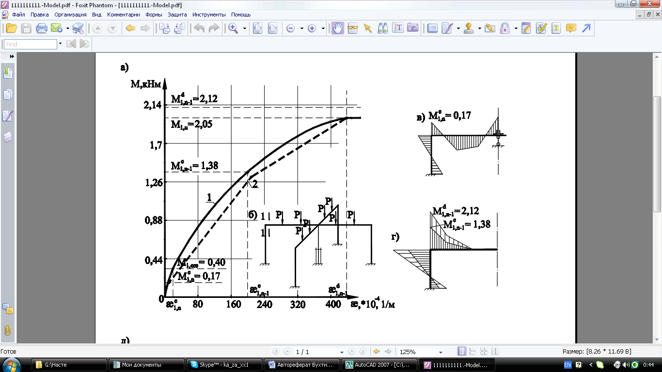 Анализируя опытные (2) и расчетные (1) кривые «момент-кривизна» для опорного сечения 1-1 фрагмента рамной системы первой серии (рисунок 2, а), можно отметить следующее. На первом этапе нагружения исходной n раз статически неопределимой системы проектной нагрузкой P в интервале 0<М<0,17 кН·м характер деформирования носил упругопластический характер с незначительно выраженной нелинейностью (рисунок 2, б, в). Значение рассчитанного в рассматриваемом сечении по максимальной проектной нагрузке изгибающего момента в ригелях, равного 0,17 кН·м, не превышало момента трещинообразования ригеля (Мcrc=0,4 кН·м). Хрупкое выключение из работы центральной стойки привело к внезапному уменьшению степени статической неопределимости конструктивной системы на единицу и, соответственно, внезапному динамическому догружению всех элементов фрагмента пространственной рамы и последующему ее прогрессирующему разрушению.