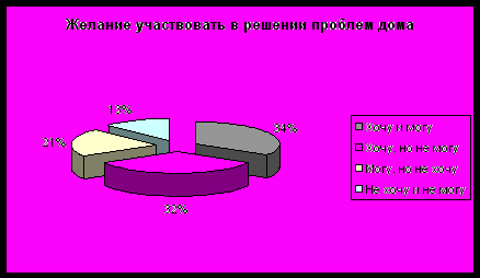 Сами же опрошенные к собственному участию в решении проблем дома относятся следующим образом: 65, 7 % хотят участвовать в решении проблем дома, но 32 % из них не имеют такой возможности, остальные 33,5 % не хотят участвовать в решении проблем дома.