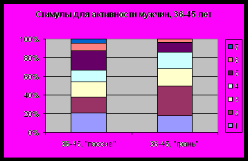 Для мужчин 26-35 лет, как для группы женщин категории «пассив» 36-45 лет и 46-55 лет, наиболее важным является получение экономической выгоды от своей активности, но также важен и положительный пример. Поскольку скорая экономическая выгода в данном виде деятельности невозможна, следует показывать возможность её получения на примере тех, кто уже этого достиг, причём в форме отчёта с конкретными цифрами (например, ТСЖ, снизившие оплату за коммунальные услуги). Следует отметить, что для женщин 46-55 лет категории «грань» при всей важности экономической выгоды возрастает роль и положительного примера – наглядного доказательства возможности получения этой