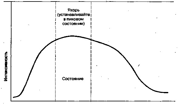 Для точности якорения старайтесь определить и использовать правильную хронологию, то есть устанавливайте якорь, когда вы видите, что состояние достигает максимальной интенсивности. Когда вам покажется, что состояние достигло пика и пошло на убыль, уберите якорь. Это нужно делать, чтобы не заякорить «ослабевающую реакцию» (!) или переход в другое состояние. «Передержка» якоря может загрязнить его, если человек войдет в другое состояние. Когда я вижу, что у человека повышается интенсивность состояния, я без раздумий воспроизвожу якорь. По мере того как состояние интенсифицируется, я увеличиваю нажим на якорь. Как только состояние начинает ослабевать, я немедленно убираю якорь. Якорь можно удерживать от 5 до 25 секунд (рис. 13.1). Навыки сенсорной остроты подскажут вам, как долго удерживать якорь.