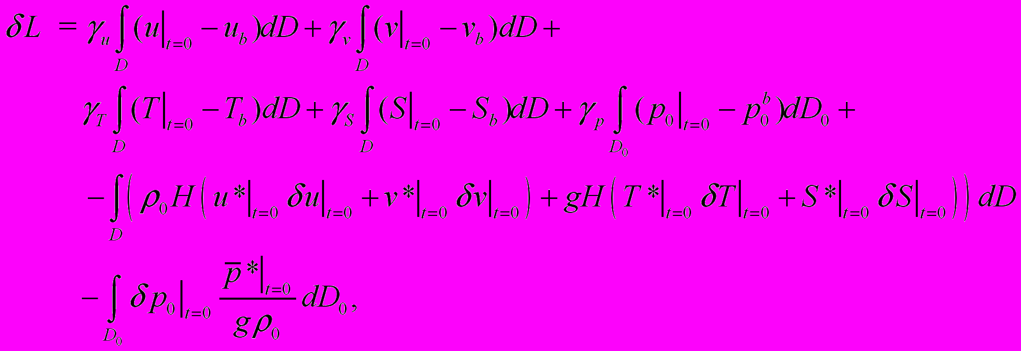 - уровень моря).В параграфе 2.2 разработан алгоритм решения задачи вариационного усвоения данных наблюдений в модели динамики океана, основанной на системе примитивных уравнений. Рассматривается система уравнений сигма-модели динамики океана с неизвестным начальным условием. Предполагается, что поля приводного давления, горизонтальных компонент вектора скорости, температуры и солености в начальный момент времени