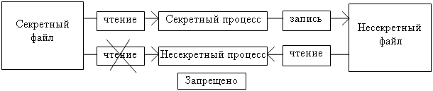 Простое правило безопасности предотвращает чтение секретного файла несекретным процессом. Оба процесса могут читать и записывать данные в несекретный файл. Однако, легко может произойти нарушение правил управления доступом, если секретный процесс считает информацию из секретного файла и запишет ее в несекретный файл. Это эквивалентно неавторизованному уменьшению класса доступа информации, хотя при этом не изменяется класс доступа ни одного файла.